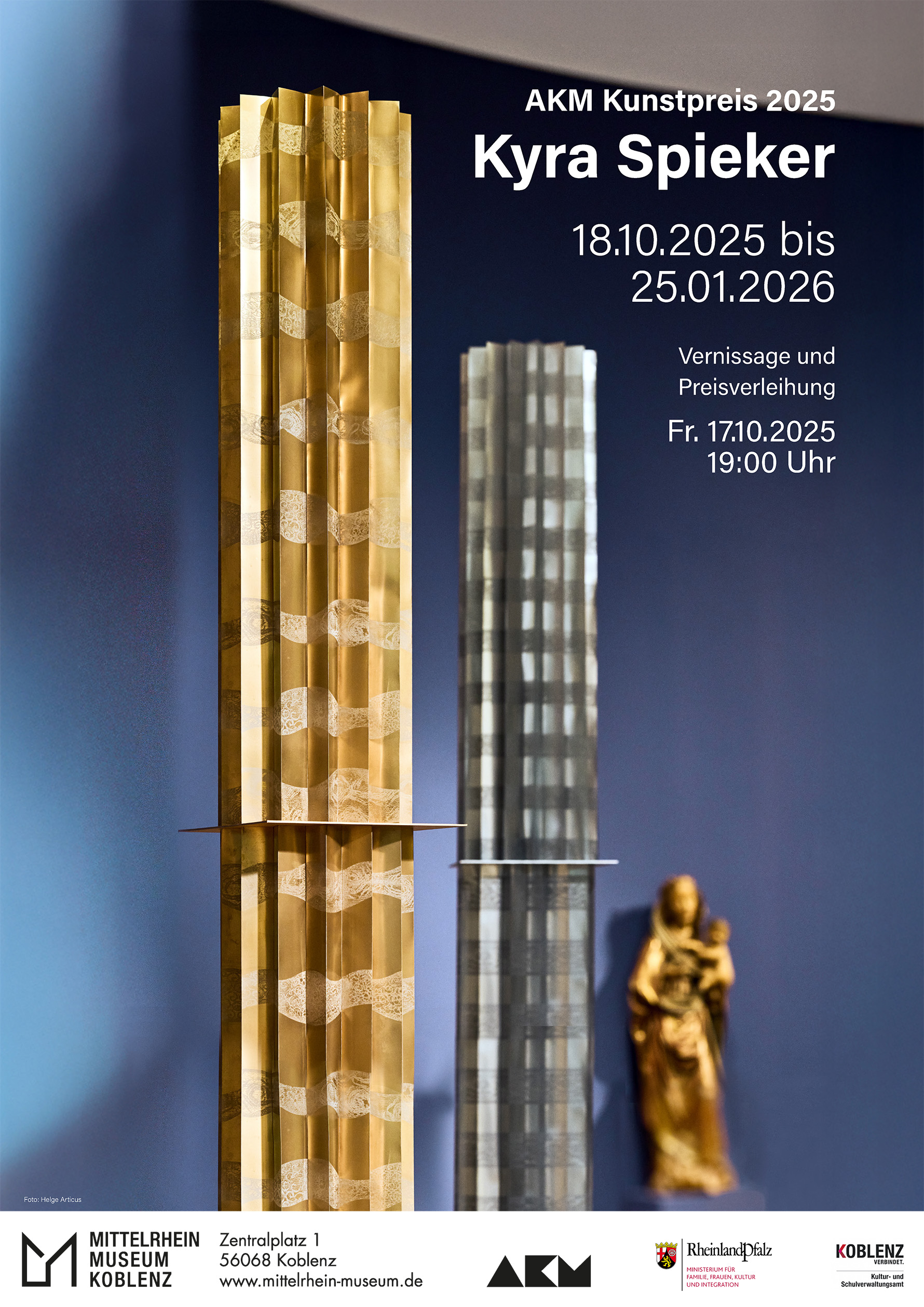 Die Preisträgerin 2025 ist die Künstlerin Kyra Spieker. Kyra Spieker (*1957), aufgewachsen in Marburg/Lahn, studierte an der Fachschule für Keramikgestaltung in Höhr Grenzhausen und Bildende Kunst an der Johannes Gutenberg Universität in Mainz. Zahlreiche Ausstellungen im In-und Ausland sowie mehrere Aufenthalte auf internationalen Symposien gehören zur ihrer Vita, ebenso wie verschiedene Förderungen des Landes RLP in Form von Stipendien. Sie lebt und arbeitet in Höhr-Grenzhausen und ist seit 2011 Mitglied der AKM.