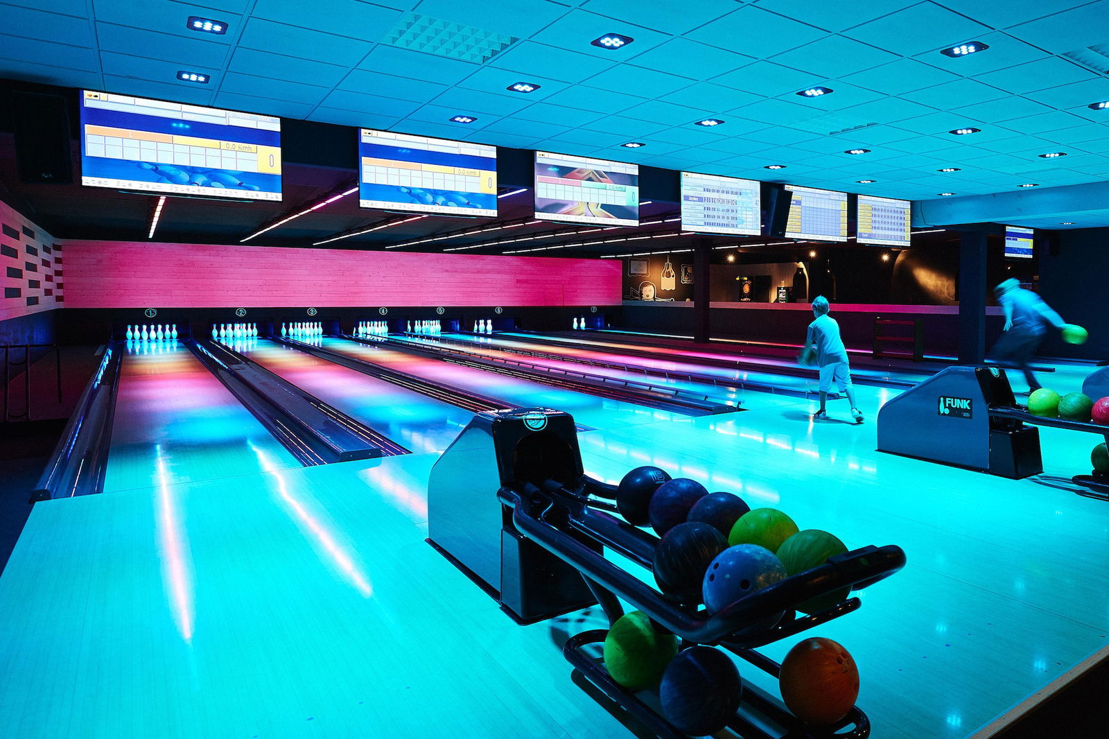 Viel Holz gibt es auch auf den sieben neu gestalteten Bowlingbahnen. Hinzu kommt eine spezielle LED-Lichttechnik, die den Raum in immer wieder andere Stimmungen tauchen kann. Außerdem gibt es Platz für zwei knallbunt lackierte Poolbillardtische und eine riesige Beamer-Projektion in der Sky-Sportsbar-Lounge. Alles nicht nur für Fußballfans, sondern vor allem für diejenigen, die den besonderen Genuss auch bei den scheinbar simplen Dingen zu schätzen wissen.