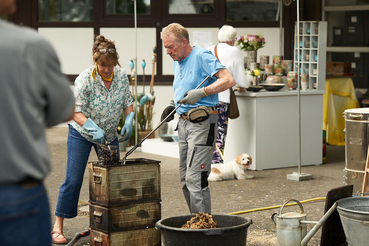 Immer wieder in den Bann ziehend sind auch die Vorführungen eines Rakubrandes der örtlichen Keramiker Ute und Arno Hastenteufel unterhalb des Keramikmuseums. Mit langen Zangen wird die rotglühende Keramik aus dem Ofen genommen und sozusagen Schockgekühlt. Damit entstehen die für den Rakubrand charakteristisch craqueleierten Oberflächen.