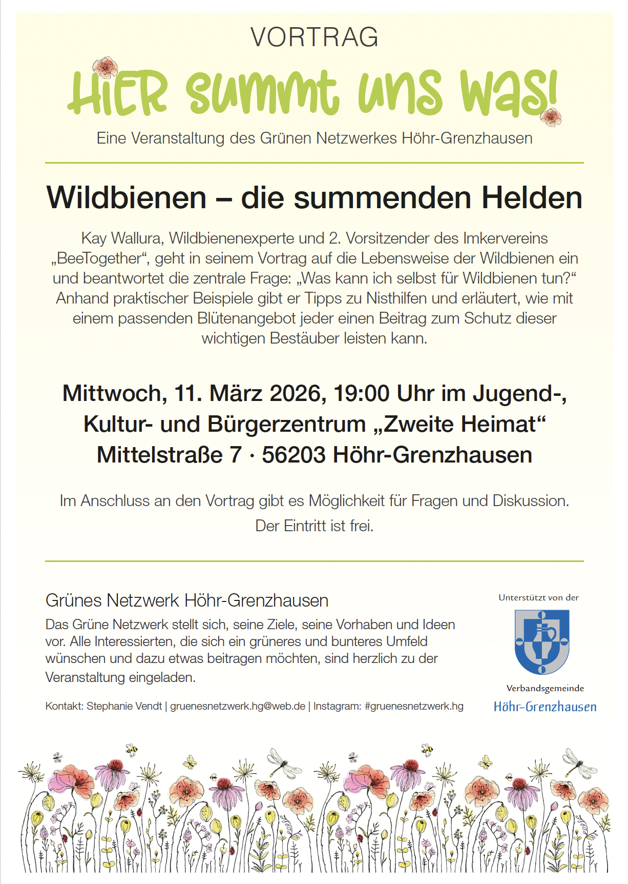 Der Eintritt ist frei. Alle interessierten Bürgerinnen und Bürger sind herzlich eingeladen. Veranstaltet wird der Abend vom Grünen Netzwerk mit Unterstützung der Verbandsgemeinde Höhr-Grenzhausen.