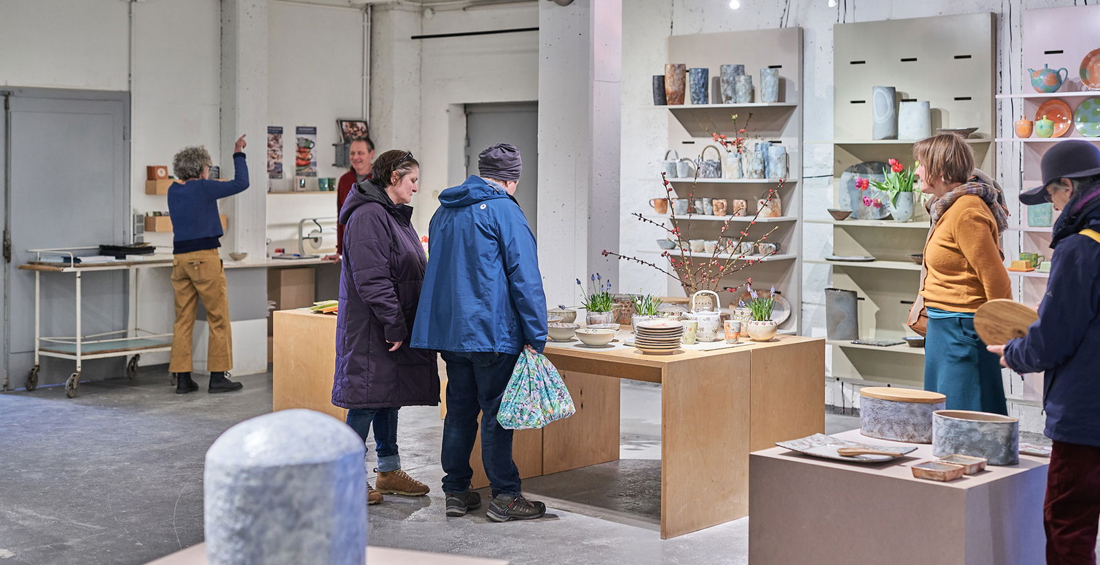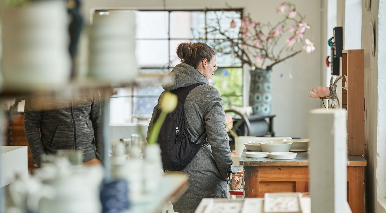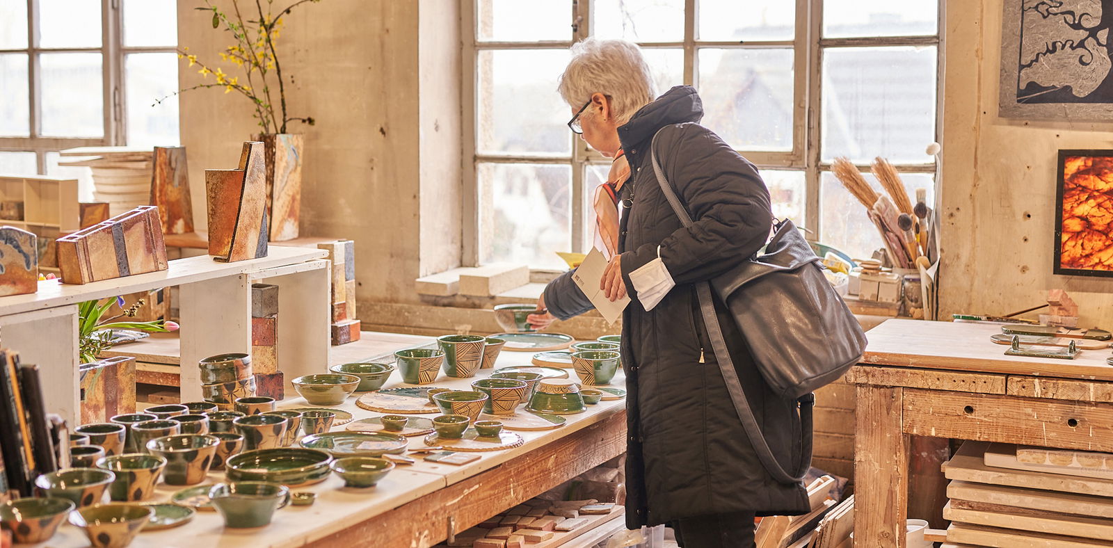 Aus diesem Grund gibt die ein oder andere gefestigte Werkstatt Nachwuchskünstler*innen die Möglichkeit, sich vorzustellen. So präsentiert das Keramische Atelier Claudia Henkel (Lindenstraße 39) neben dem eigenen Porzellangeschirr die Werke zweier junger, talentierter Kolleginnen: Petroula Koutousi zeigt feinen Porzellanschmuck und spannende Wandarbeiten, während Laura Bouyer nebelhafte Berglandschaften auf handgefertigten Gefäßen präsentiert.