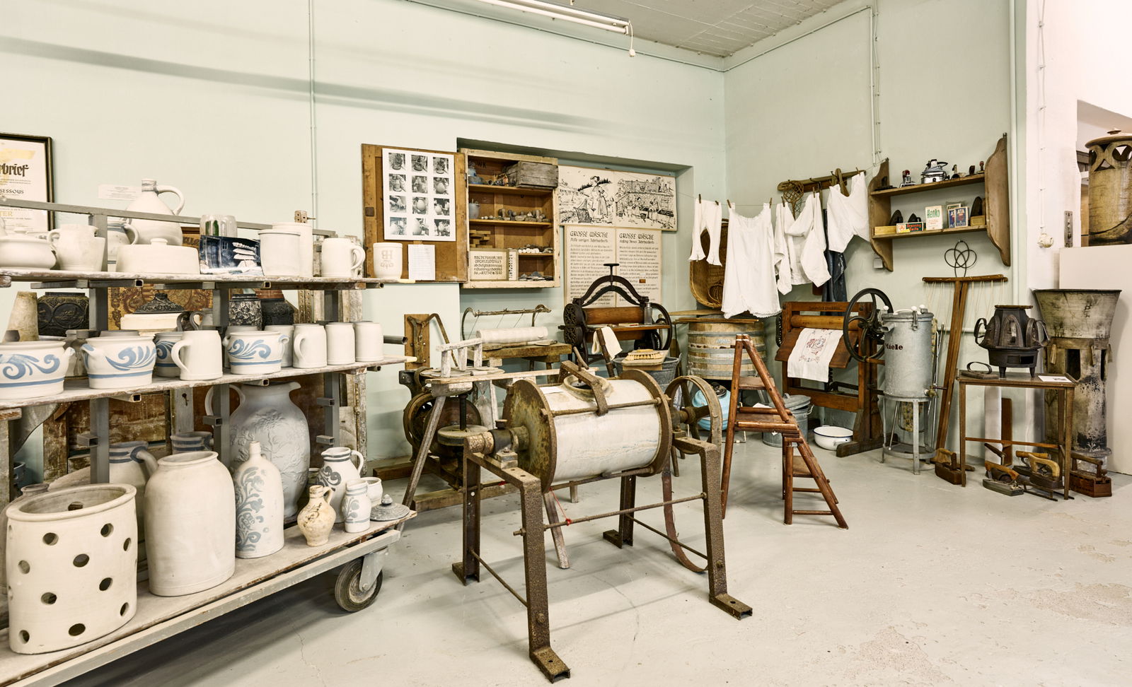 Ein Blick in die Sammlung, welche Keramik, eine Pfeiffenwerkstatt sowie alte Stücke aus dem Alltag zeigt.