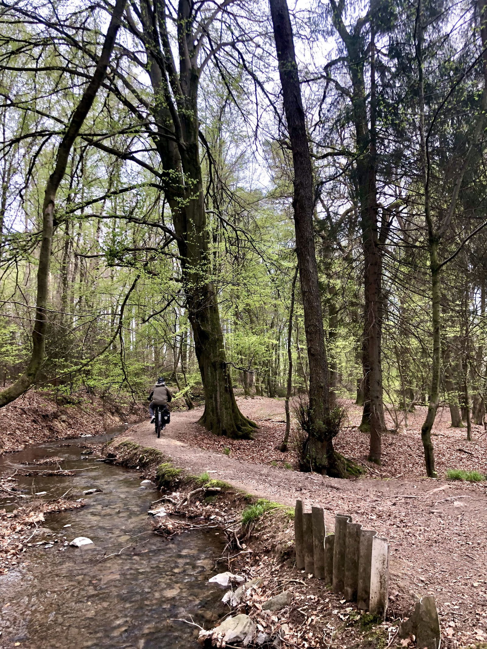Vom Landshuber Weiher führt eine kleine Brücke über den Bach, wir fahren ein Stück hinauf bis zum Flürchen, wie der Wald hier heißt. Eine gut befestigte Piste aus feinem Schotter führt den Berg hinab, hier kann gut beschleunigt werden, das macht Spaß.