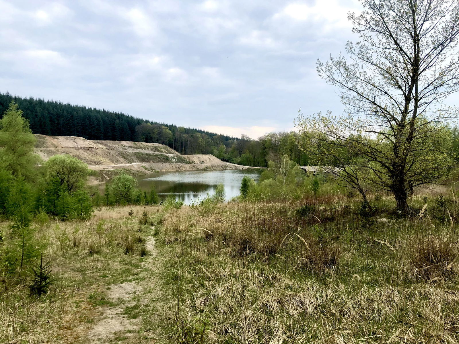 Wir passieren den Wäller Weg und kommen wieder in den Wald. Hier versteckt sich eine Tongrube, genannt Höhrer Löcher. Ein Abstecher könnte sich lohnen. Wir nehmen den asphaltierten Waldweg ein Stück bergab und finden rechts einen Pfad, der zur Tongrube führt. Es ist ein Versuch wert. Wir radeln hinein, links an einem Zaun entlang, und ein Stück hinab, genießen den Blick. Die ehemalige Tongrube wird renaturiert. Der Pfad führt allerdings nicht weiter an der Grube vorbei, es wird weiter hinten viel Holz gelagert, sodass der Weg versperrt ist, so fahren wir wieder zurück zum asphaltierten Weg.