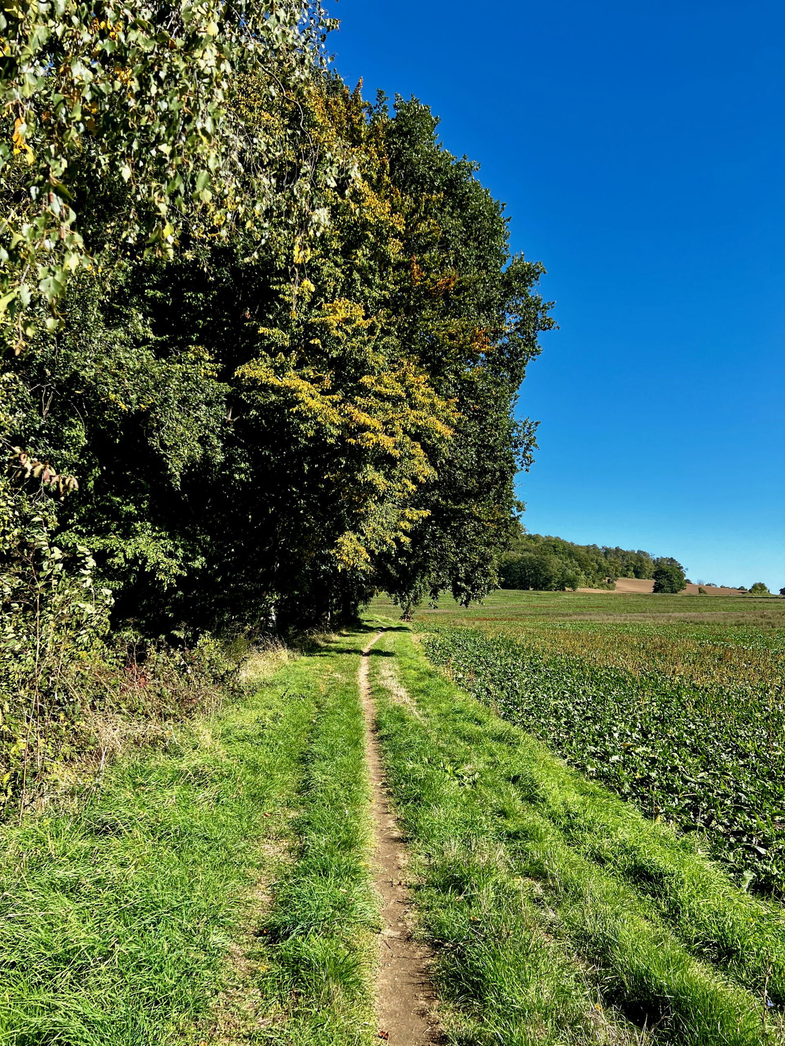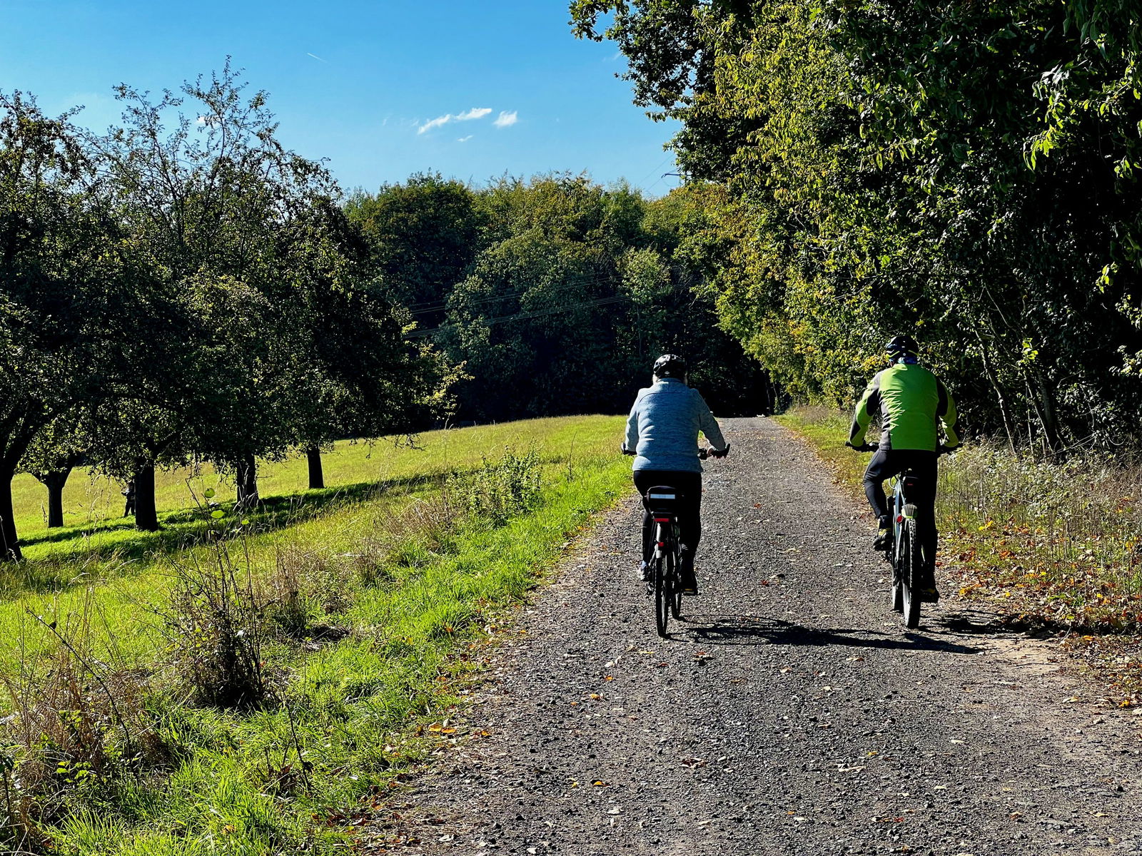 Weiter geht’s an Streuobstwiesen vorbei, Birnen, Äpfel und Quitten sind reif. Traktoren sind unterwegs und pflügen die Felder. Wir unterqueren nun die Autobahn, fahren ein Stück auf der Landstraße, nehmen dann aber alsbald den nächsten Feldweg, der dann aber direkt in einer Wiese endet, in der sich allerdings noch ein Weg andeutet, es geht ein kleines Stückchen bergab und wir sind auf einer schönen Schotterpiste und fahren rechts weiter.