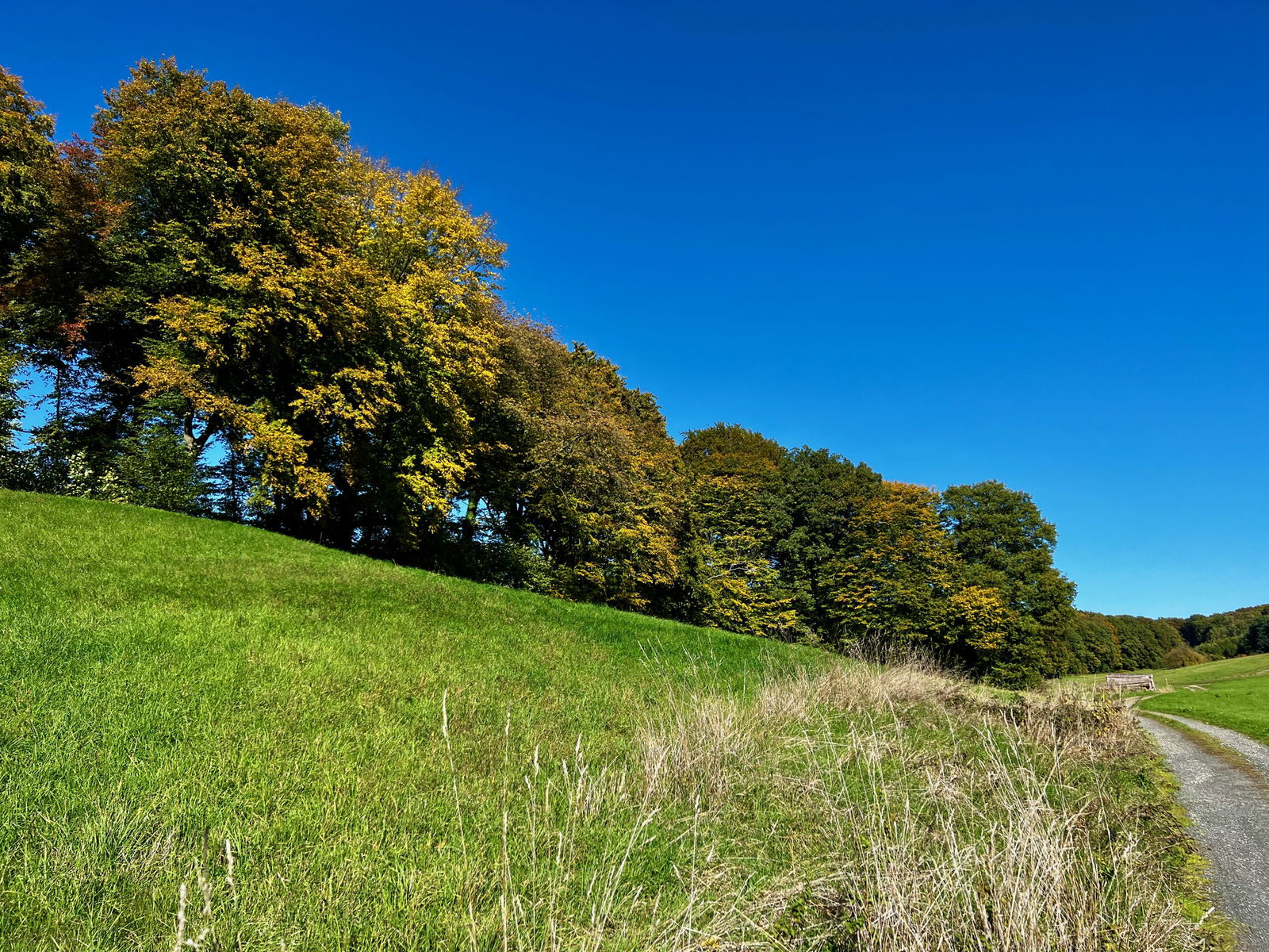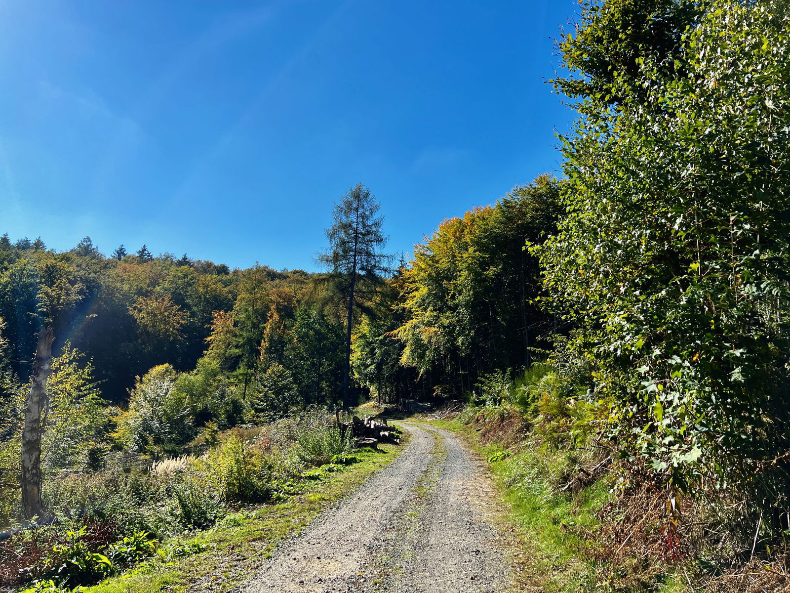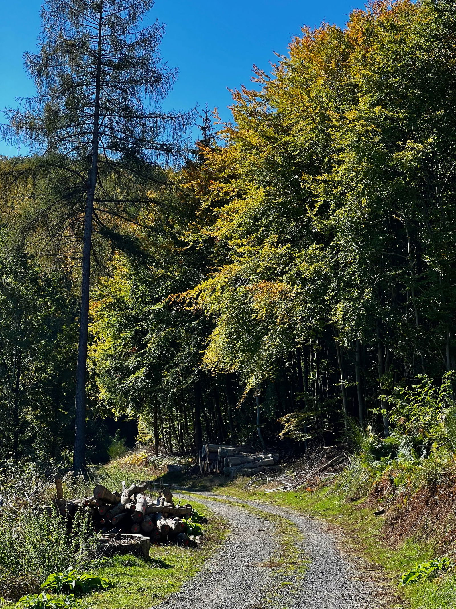Jetzt geht’s in den Buchenwald, hier kurven wir ein wenig um den Schwarzenberg umher, mal links, mal rechts, wir fahren oberhalb des Ferbachtals entlang. Noch ist vieles sehr grün. Wir entdecken hier und da Pilze, die wir allerdings lieber dort stehen lassen. Die ersten Bäume färben sich goldgelb.