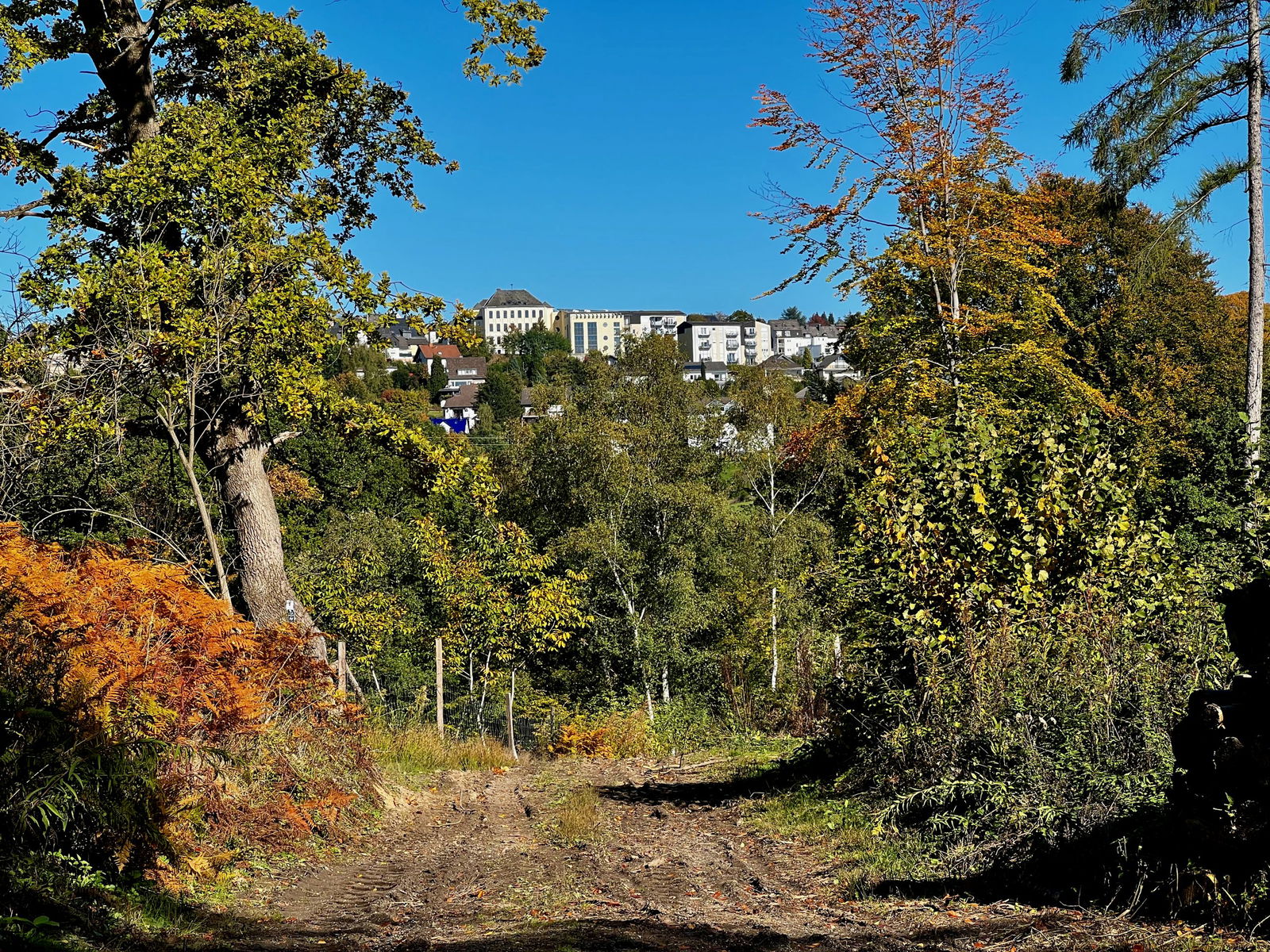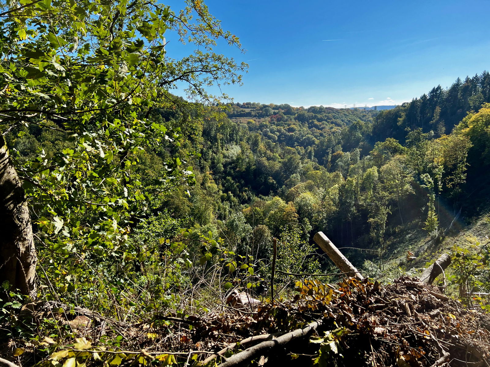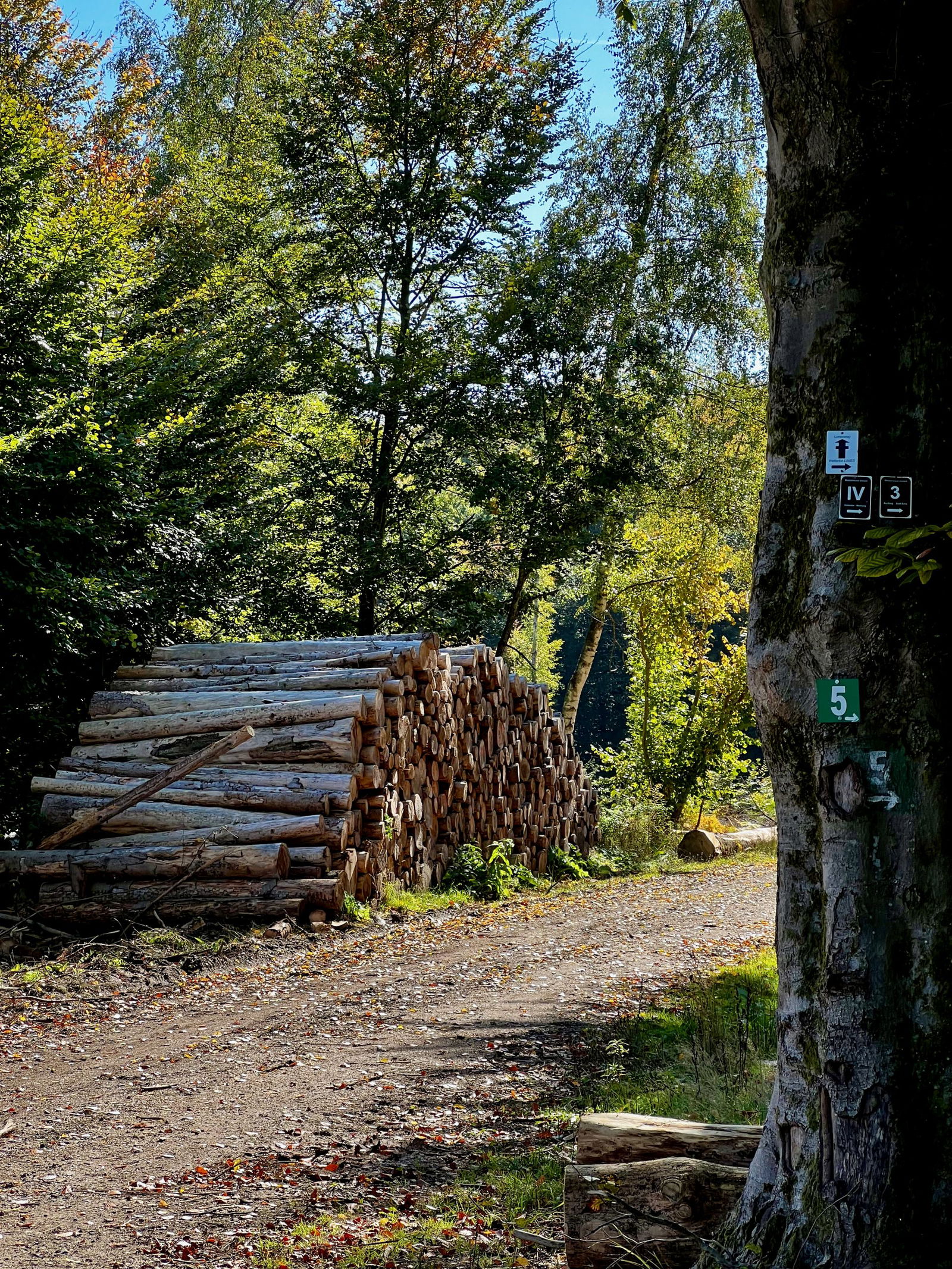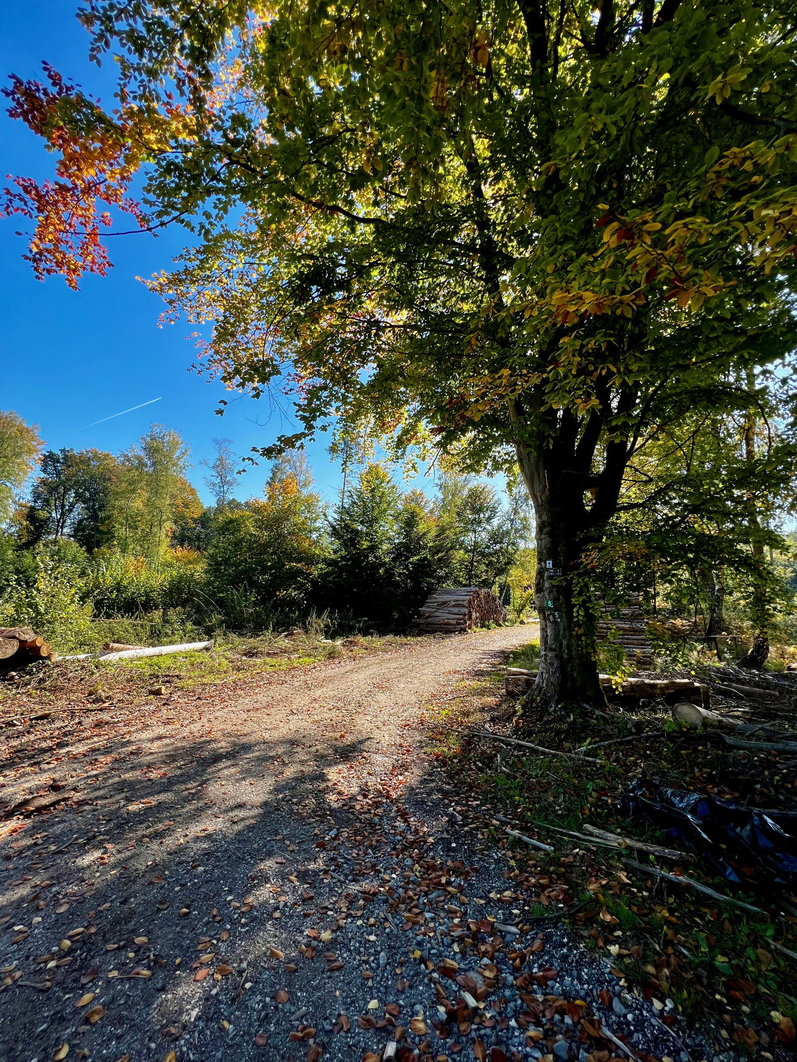 Jetzt geht’s in den Buchenwald, hier kurven wir ein wenig um den Schwarzenberg umher, mal links, mal rechts, wir fahren oberhalb des Ferbachtals entlang. Noch ist vieles sehr grün. Wir entdecken hier und da Pilze, die wir allerdings lieber dort stehen lassen. Die ersten Bäume färben sich goldgelb.
