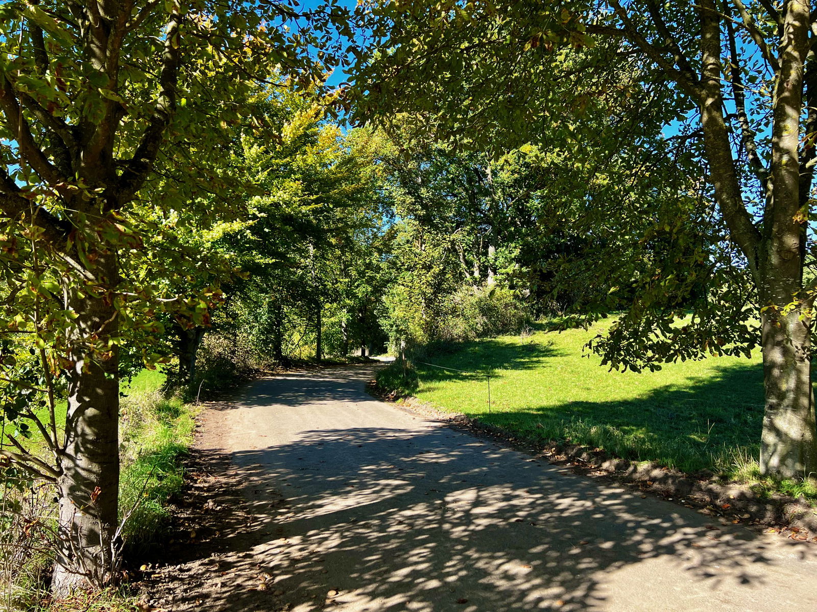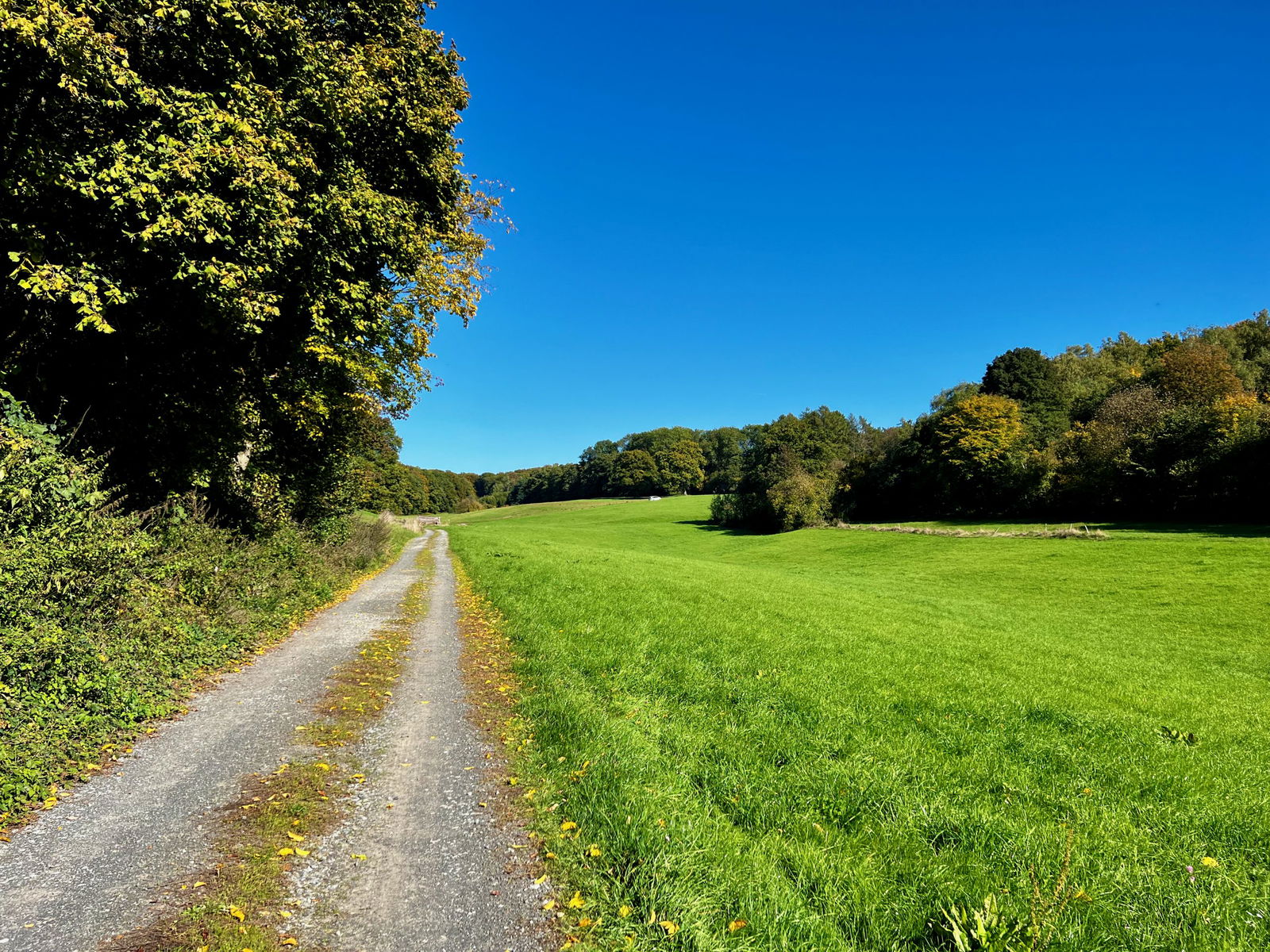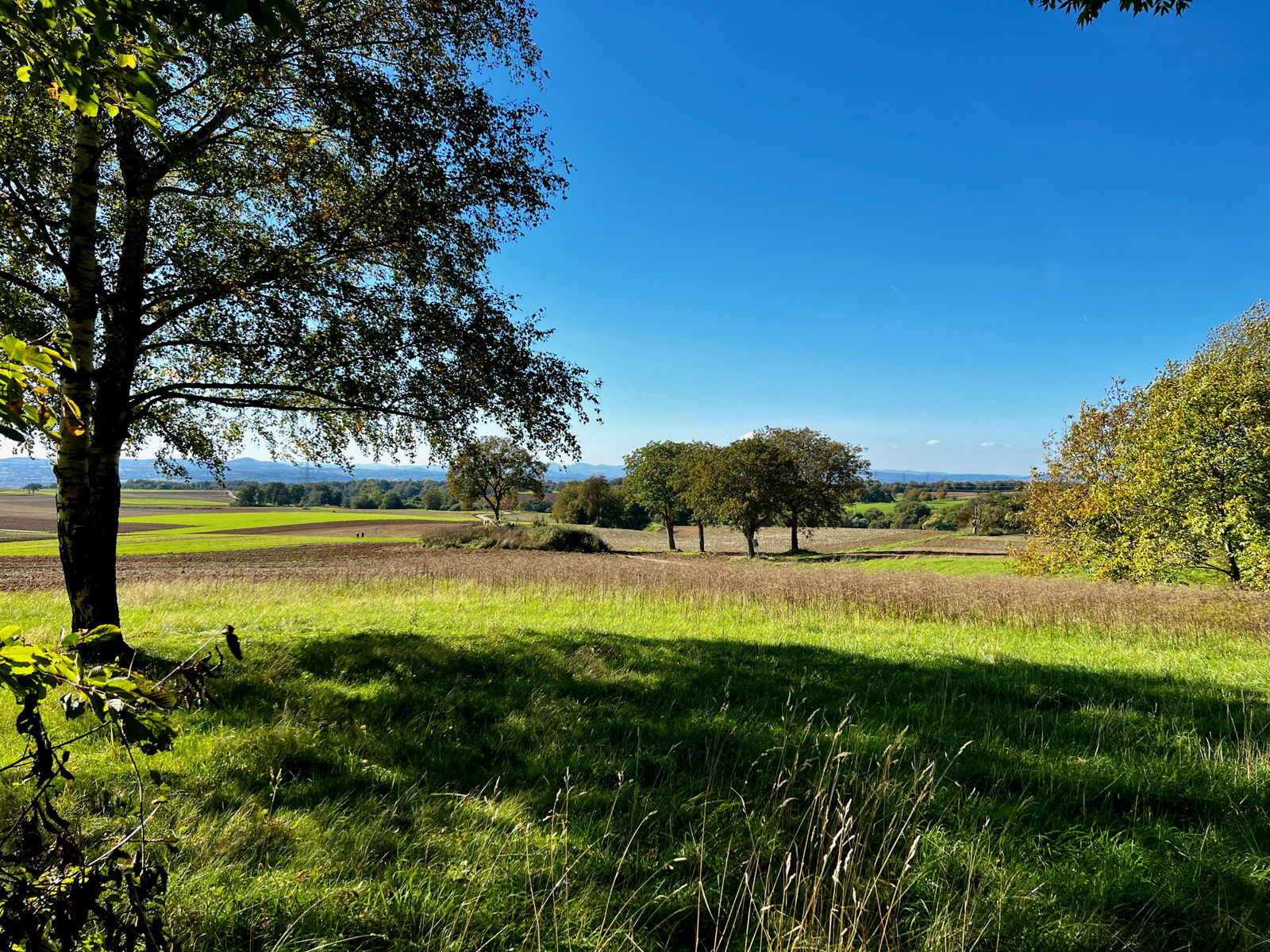 Wir kommen aus dem Wald heraus, ein fantastischer Weitblick über Felder und Wiesen erwartet uns, es geht ein Stück über asphaltierte Wege weiter.