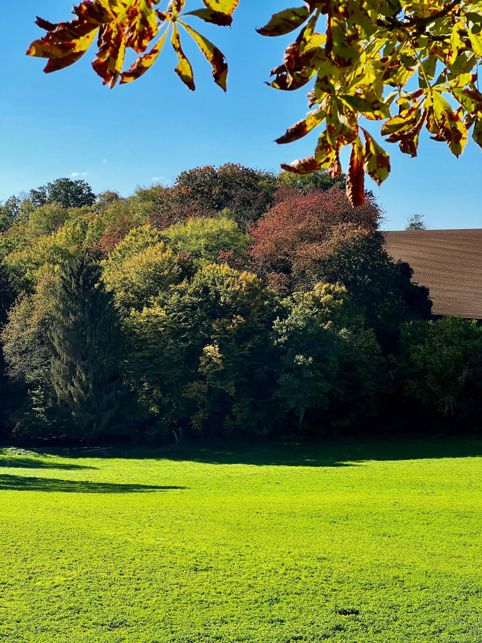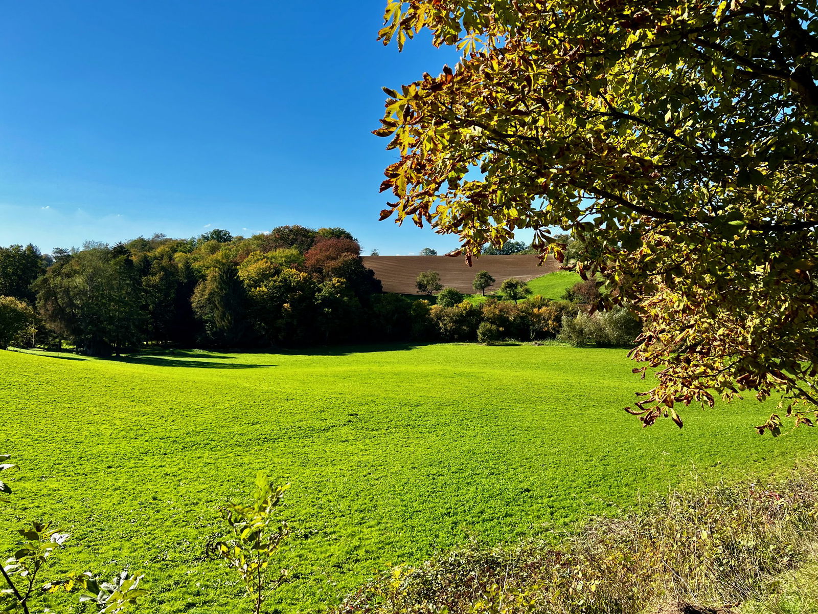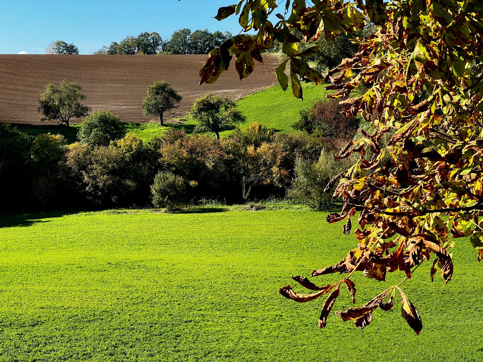 Dieser wunderbare Sonntag im Oktober lädt zu einer weiteren E-Bike-Radtour ein. Mehr als 15° Grad, blauer Himmel, noch sind viele Pflanzen sattgrün, hier und da blüht es noch. Kastanien, Walnüsse, Eicheln, Äpfel, Birnen, Hagebutten und noch vieles mehr sind reif. Die ersten Bäume wechseln ihr Baumkleid und leuchten in goldgelb oder orangerot. Einige Pilze zeigen sich auf den Waldböden, was sitzen wir noch zu Hause herum. Also raus nach draußen.
