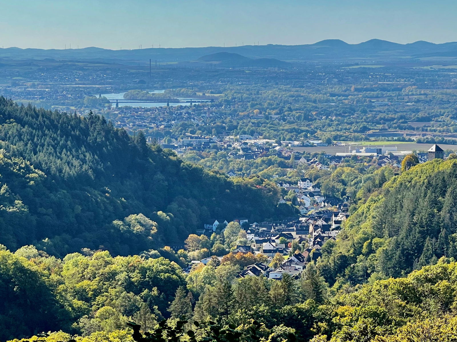 Der Weg führt nun wieder über eine Schotterpiste durch den Wald. Das macht Spaß. Wir fahren um die Ecke und werden schon wieder mit einer traumhaften Fernsicht belohnt. Am Römerturm am UNESCO Welterbe Limes genießen wir einen tollen Blick nach Bendorf-Sayn.