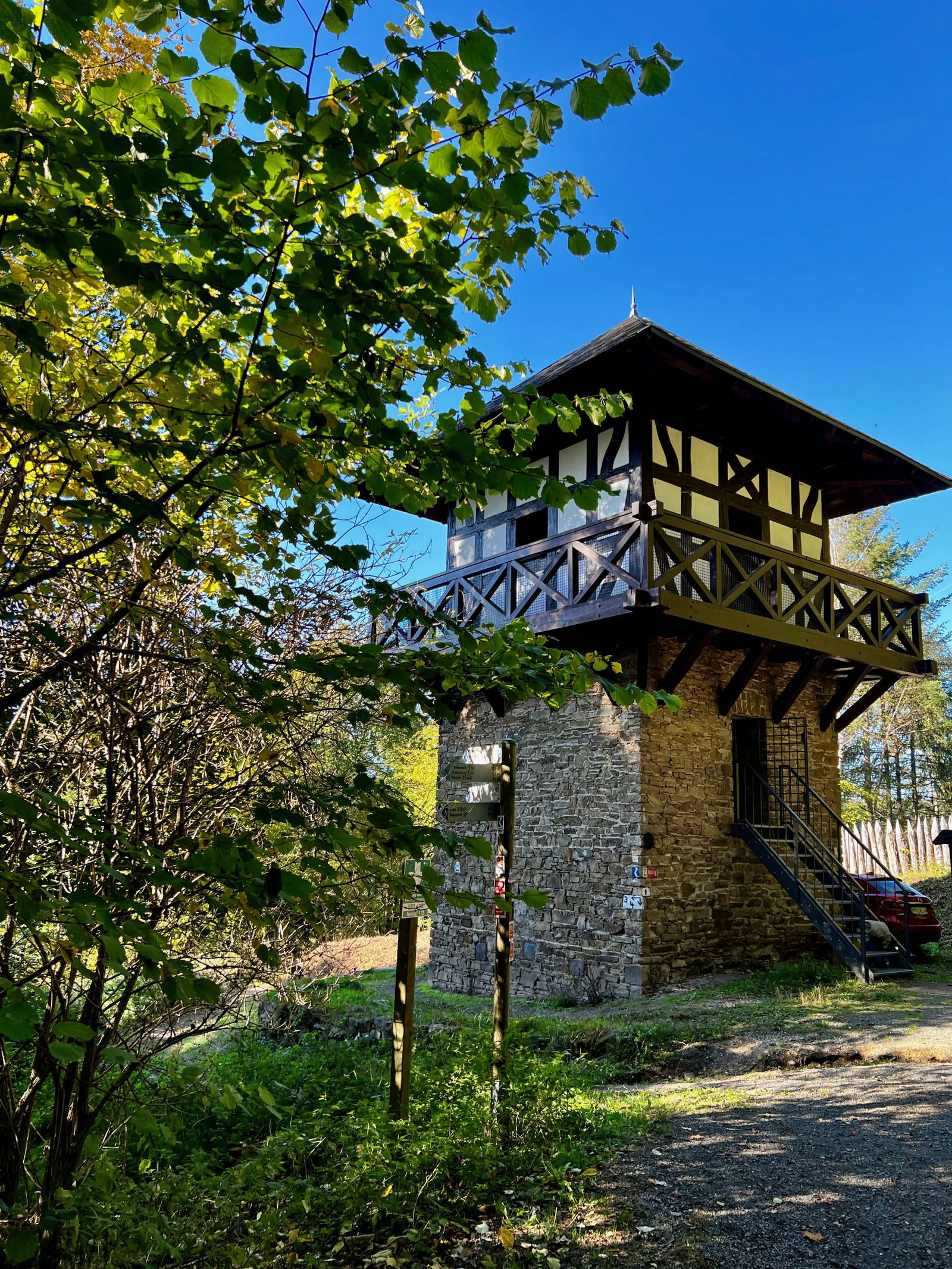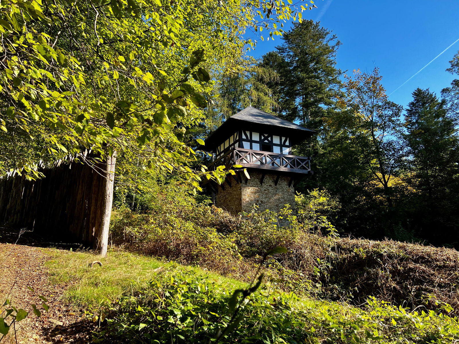 Wir sind auf dem Pulverberg in Bendorf-Sayn, hier kreuzen sich die Premiumwanderwege Rheinsteig und der Traumpfad Saynsteig. Hier entstanden 1912 die denkmalgeschützte Rekonstruktion des römischen Wachturms mit Wall und Palisaden.