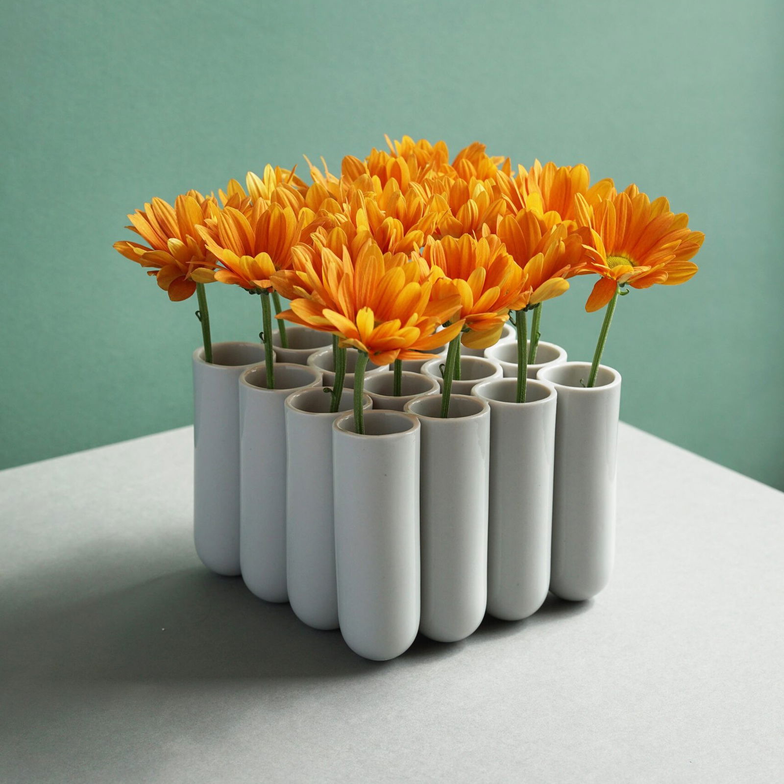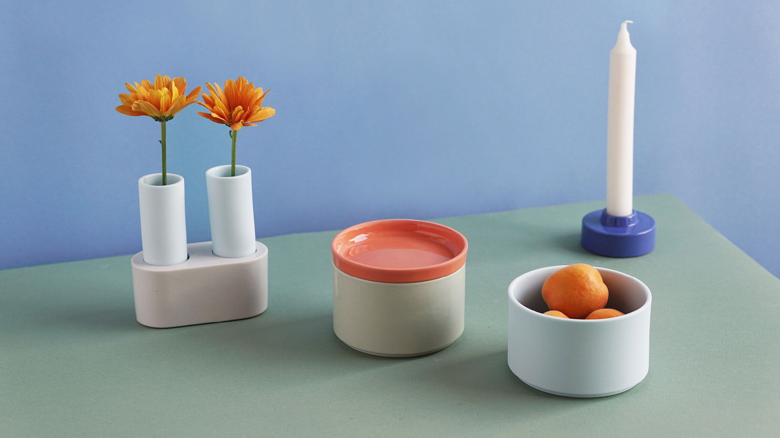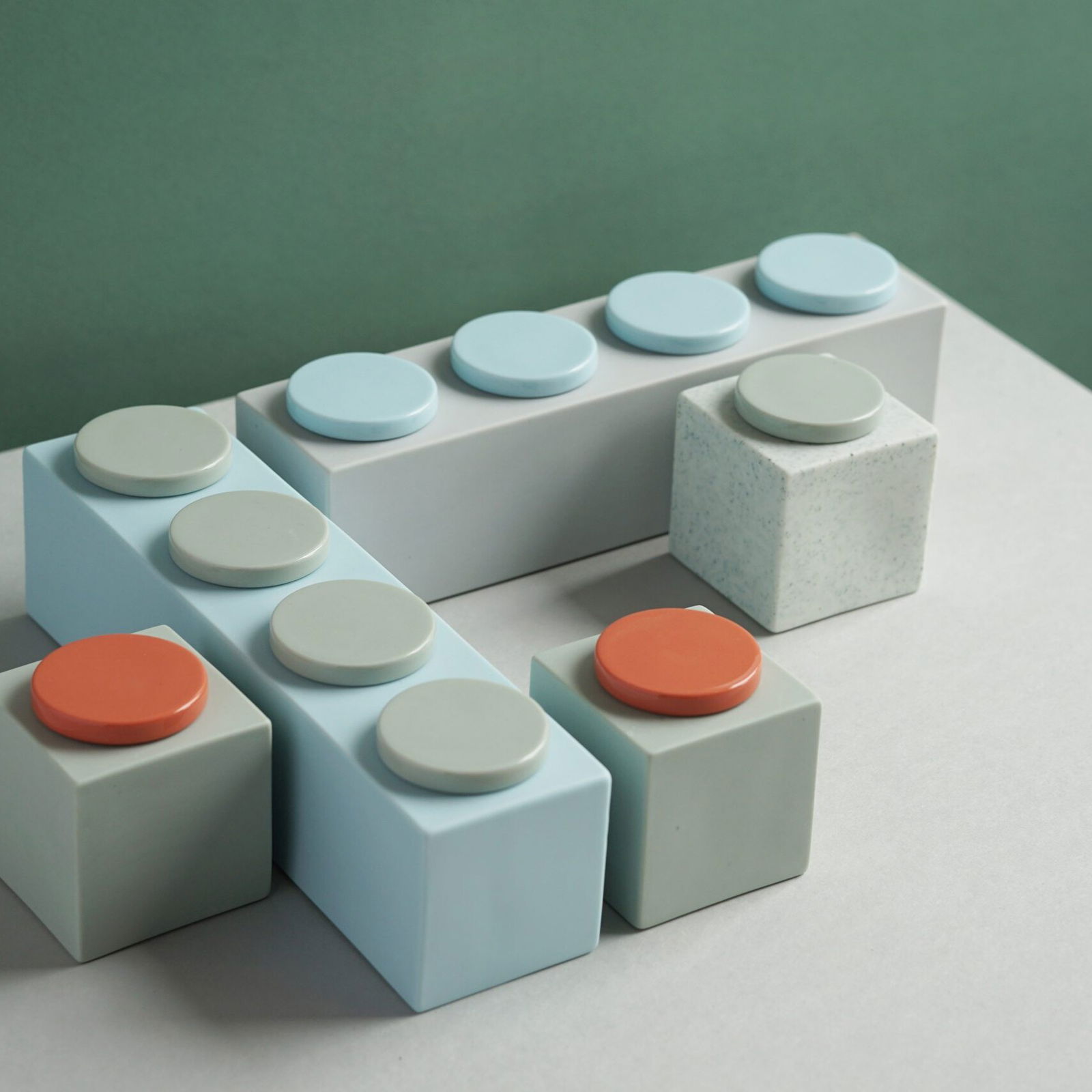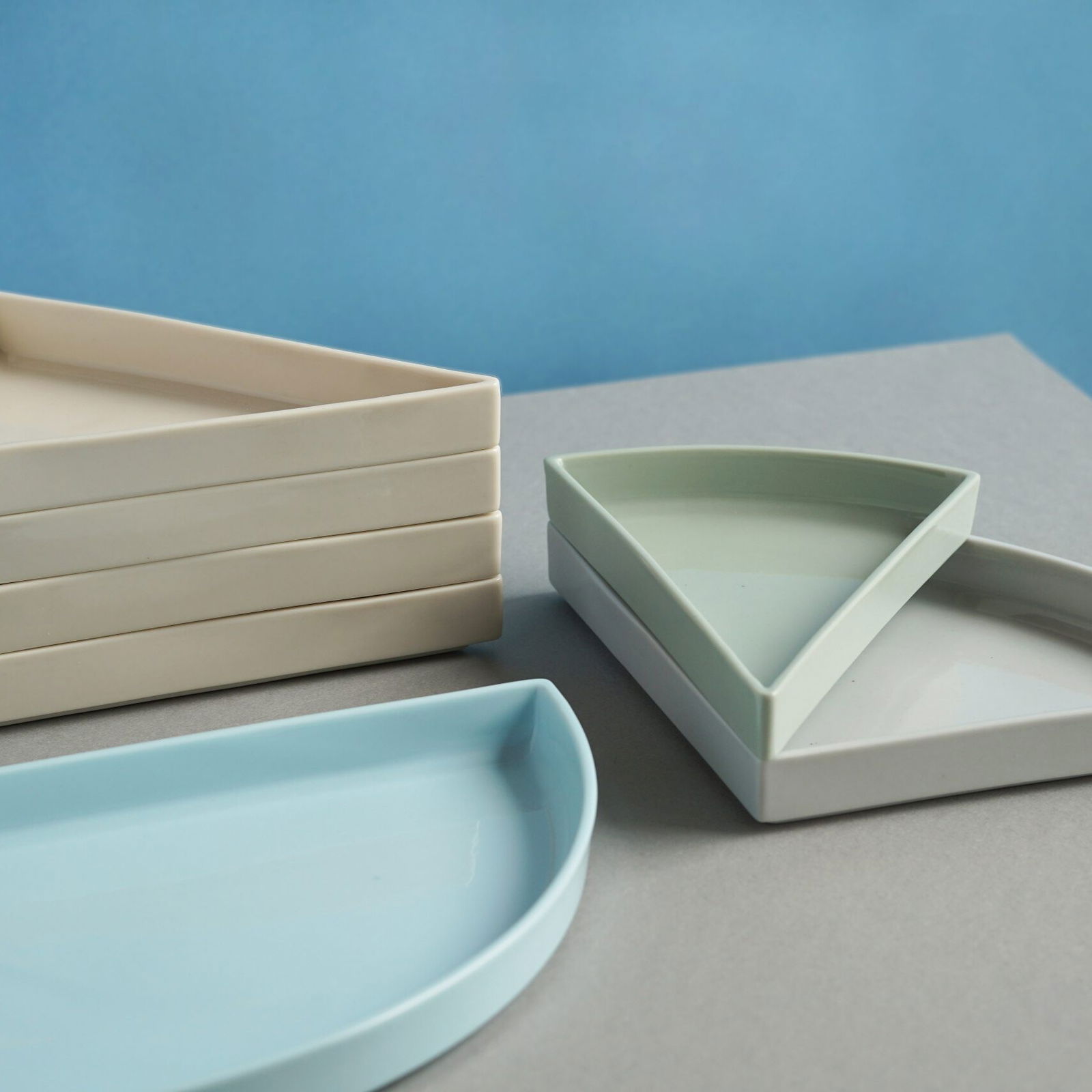 Die Objekte wurden mittels Schlickerguss aus eingefärbter Porzellanmasse hergestellt. Eine transparente Glasur schafft Kontraste zwischen glänzenden Oberflächen und dem matten Satin-Finish der Bisquitporzellanoberfläche.