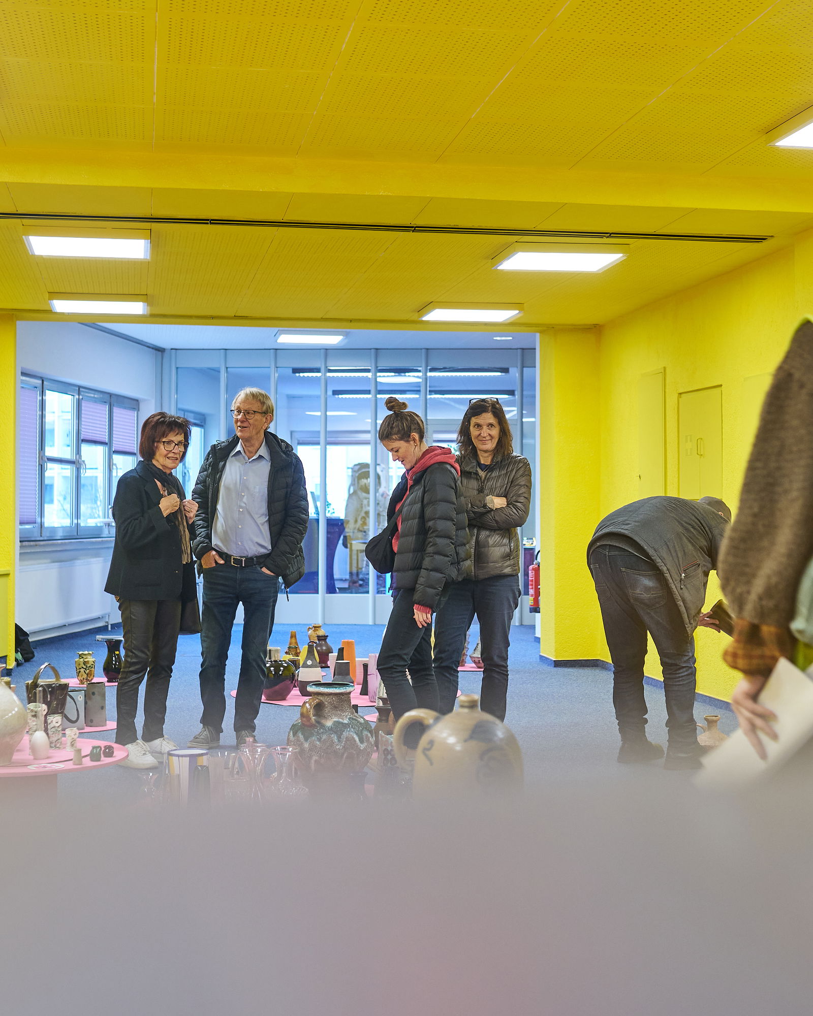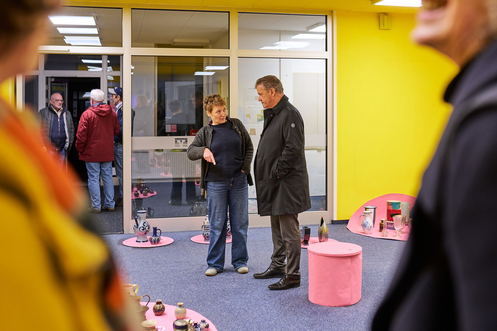 Vorab wurde der Leerstand kurzerhand in einen Ausstellungsraum in leuchtendem Gelb und Pink verwandelt, um die gebrachten Vasen wirkungsvoll in Szene zu setzen. Schon beim Abgeben der Gefäße füllte sich der Raum schnell: Besucherinnen tauschten Anekdoten, Geschichten und Erinnerungen zu den Vasen aus, entdeckten neue Stücke und nahmen schon mal spontan eine Vase in den Blick, die sie im Tausch mitnehmen würden. Auch Keramikerinnen nutzten die Gelegenheit, Fachwissen auszutauschen, Herkunft und Entstehungszeit einzelner Objekte zu diskutieren und das Sammelsurium gemeinschaftlich einzuordnen.