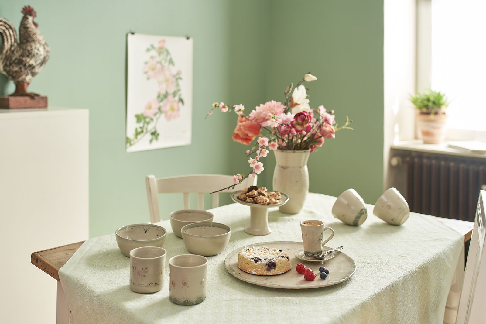 Alina Penninger formt liebevoll handgefertigtes Geschirr aus Westerwälder Steinzeugton auf der Töpferscheibe. Die meist floralen Dekore sind anmutig und still. Die vielfältigen Formen entstehen in der Atmosphäre einer alten gewachsenen Werkstatt, inmitten eines romantischen Gartens.