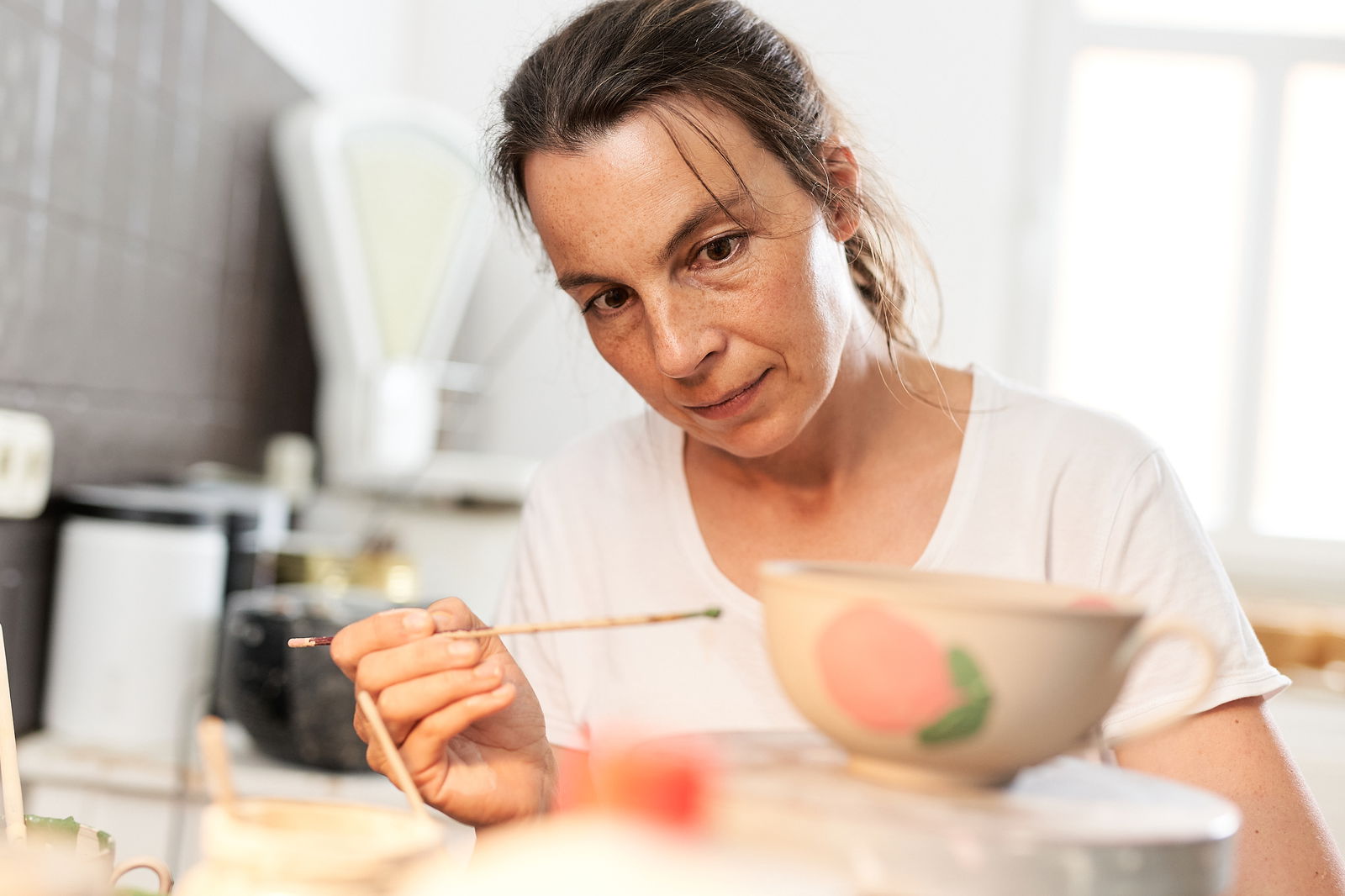 Also ich denke einfach viel nach. Bei Tassen brauche ich ja nicht mehr aufpassen, was ich tue. Und deswegen hat das so ein bisschen diesen Fließbandcharakter. Ich denke dann halt so viel. Aber das tut auch ganz gut.