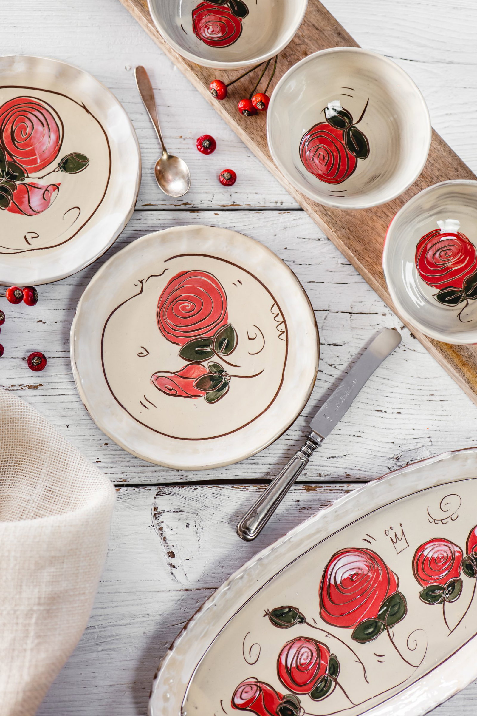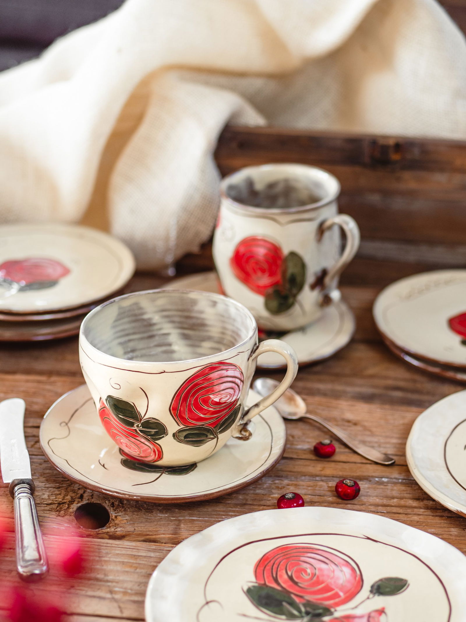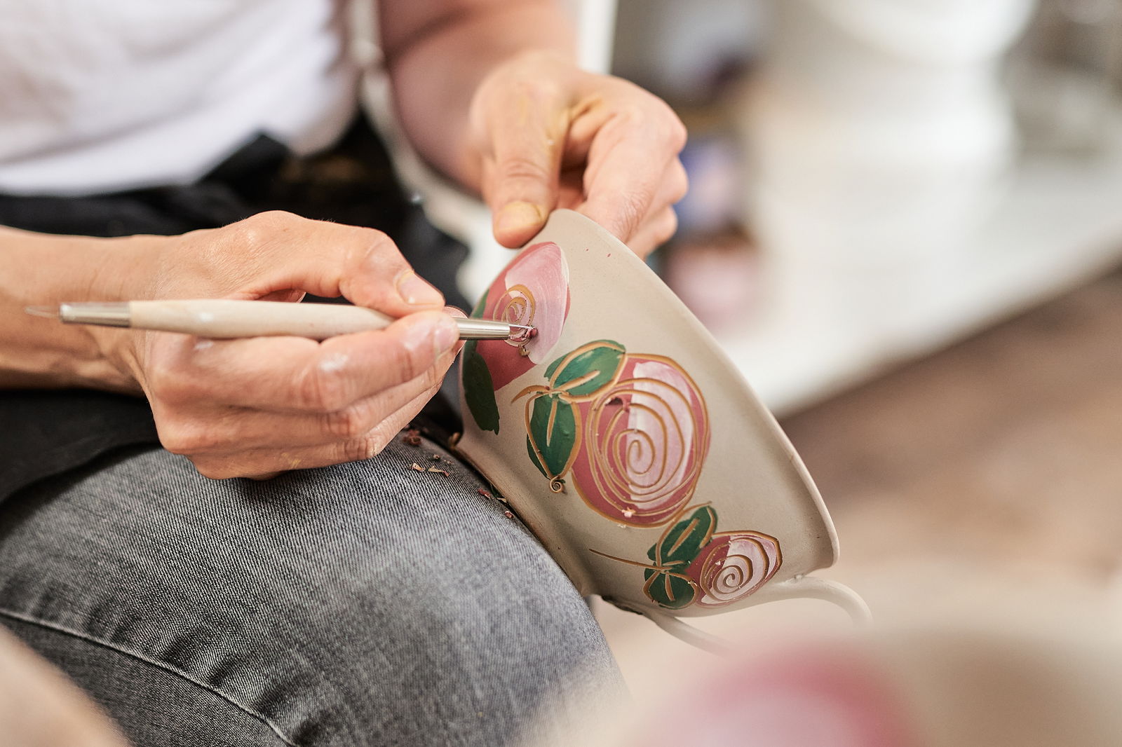 Ja, gerade mit dem Rosendekor, muss ich sagen, das Geschirr drehen, das ist schon manchmal wie Fließband. Das ist Fließbandarbeit. Die ganze Dreherei auch. Nichtkeramiker, die denken ja auch immer, das sei so ein schöner Beruf, du verwirklichst dich selber und das ist so meditativ.