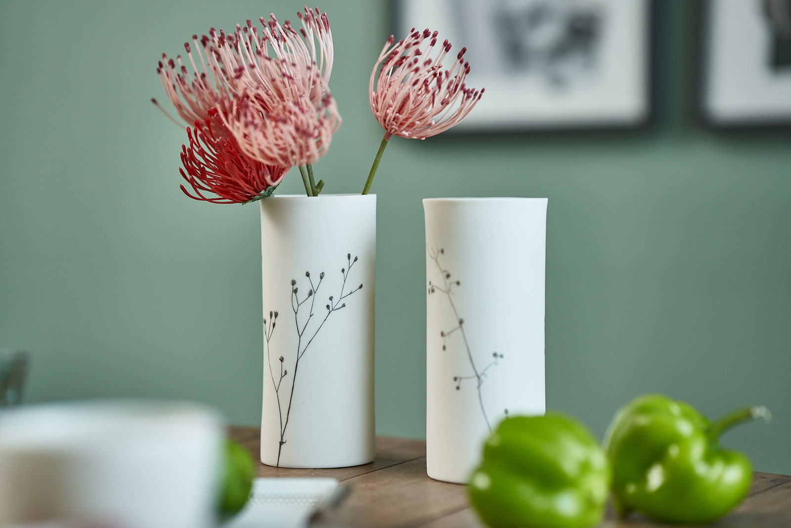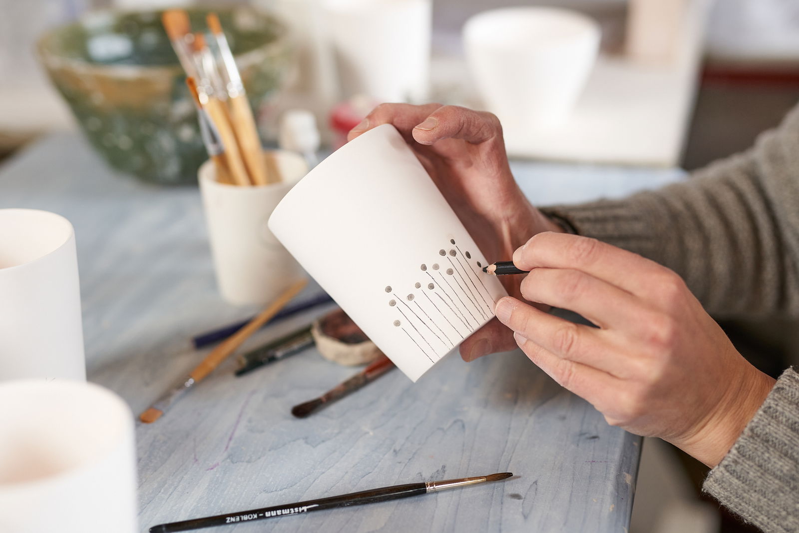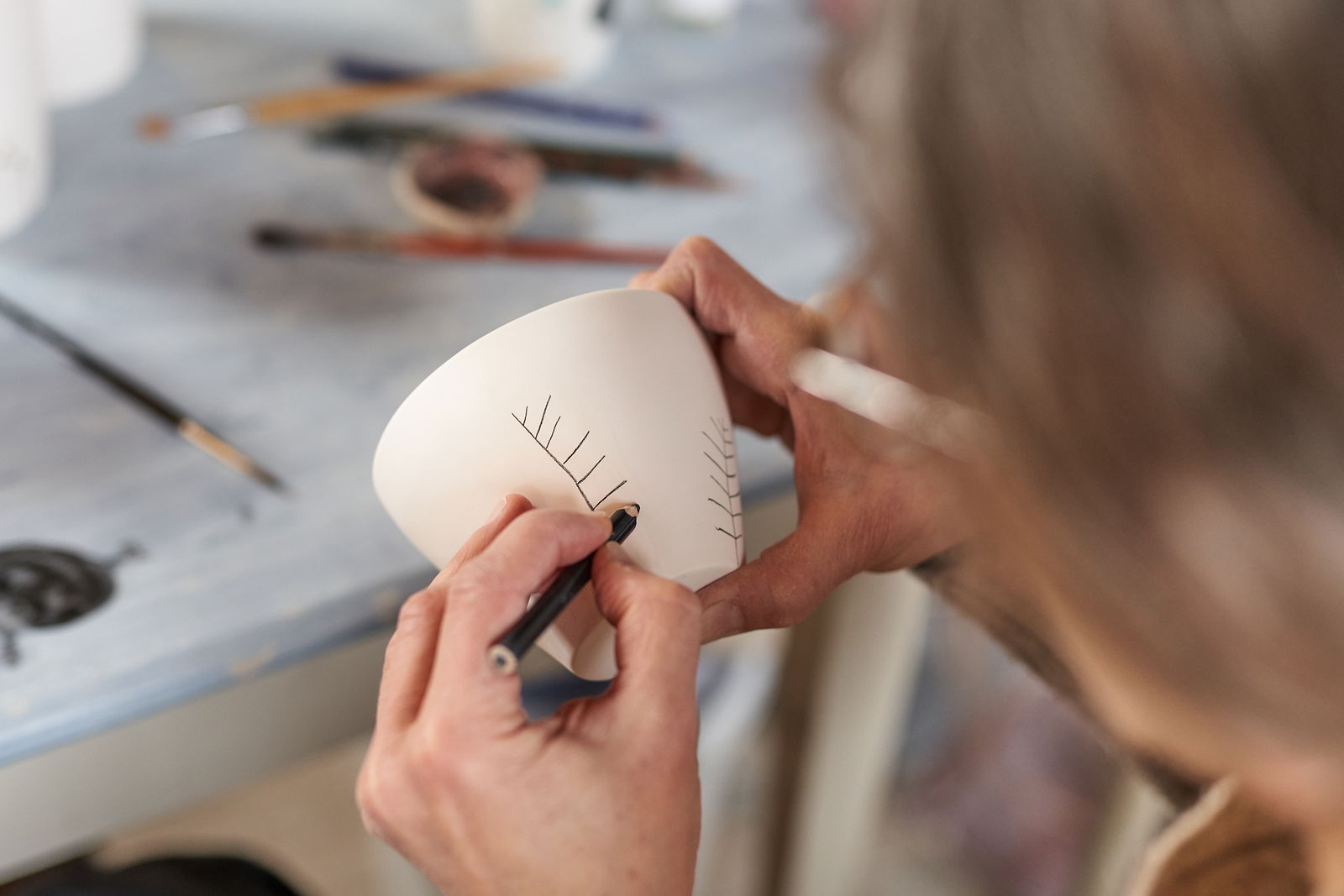 Strich für Strich bilden sich die zarten, grafischen Dekore von Katrin Bachmanns Porzellangeschirr.