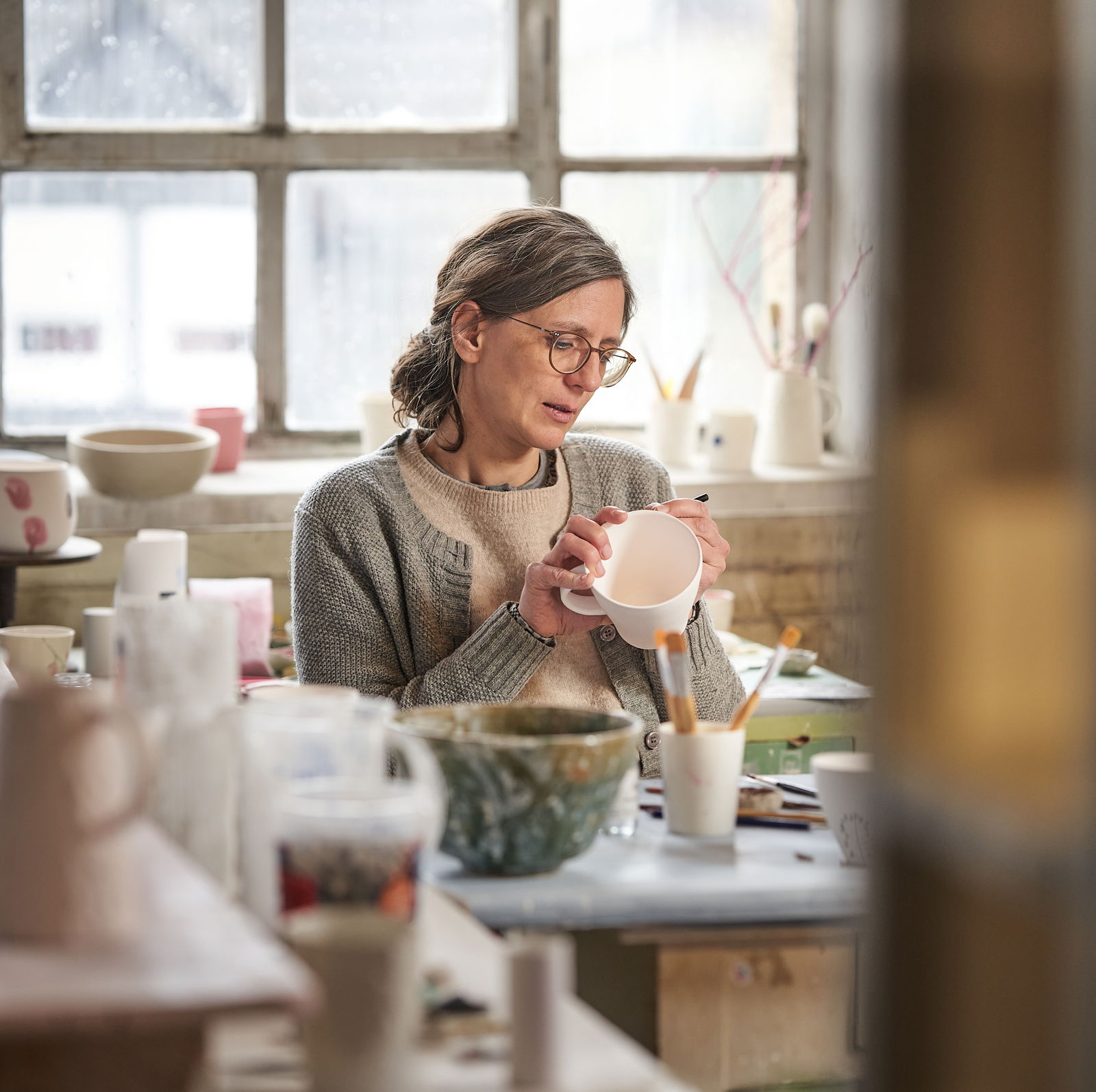 Ok, dann wäre die Antwort darauf, dass ich mich auf jeden Fall als Keramikerin sehe, aber irgendwas zwischen Künstlerin und Handwerkerin. Ich finde, das ist bei handgemachten Gefäßen oft schwierig. Gemälde sind immer Kunst, auch wenn sie nur das Wohnzimmer dekorieren sollen. Da frage ich mich immer, wo ist denn der Unterschied, ob ich nun eine Tasse bemale oder eine Leinwand. Das ist doch fließend.