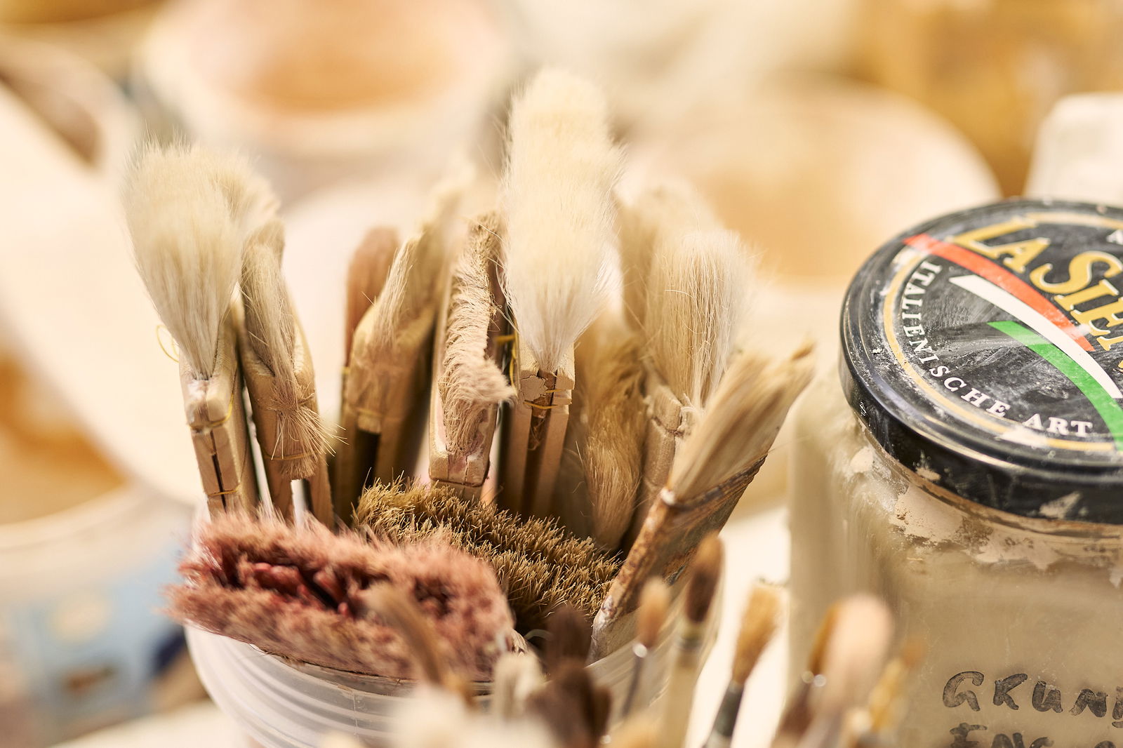 Ja, wir hatten einen Markt, da haben wir ganz gut verkauft, aber dann ist Verena ausgestiegen. Ich glaube, wir haben es nie so richtig erfahren, aber wir waren ihr zu chaotisch. Tine und ich, wir sind so, dass wir alles zusammenschmeißen können. Wir nutzen alle Pinsel, alle Farben, Tone, Glasuren, jeder alles vom anderen …. Und Verena, die saß zwischen uns und für sie war das wahrscheinlich zu chaotisch. Sie hat das nie so gesagt, aber sie war dann plötzlich weg. Dann kamen und gingen verschiedene Kollegen, bis zur heutigen Konstellation.